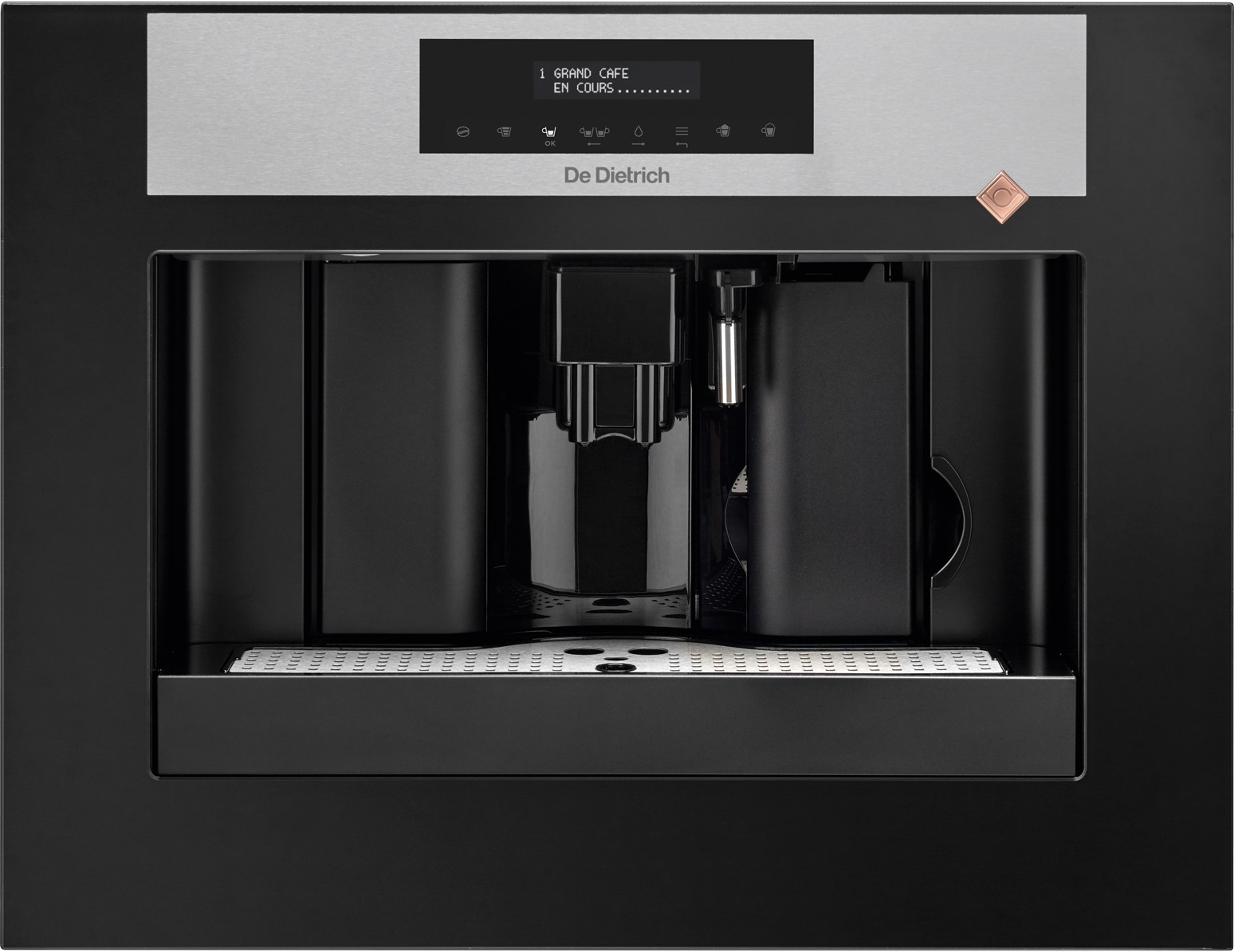 Вбудована кавоварка De Dietrich DKD7400X Espresso з колекції Platinum подарує вам новий образ життя. Її дизайн адаптований до всіх приладів De Dietrich з колекції Platinum. У ній поєднуються приблизна функціональність і дуже сильний заряд позитивних емоцій. Точно такий же заряд ми отримуємо після вечері за чашкою чудової кави з насиченим смаком і ароматом. Кофемашина регулює ступінь помелу зерен, а також температуру і кількість води і кави. Має функції «Каппучино» і «маккіато». Встановлюється на телескопічні напрямні.