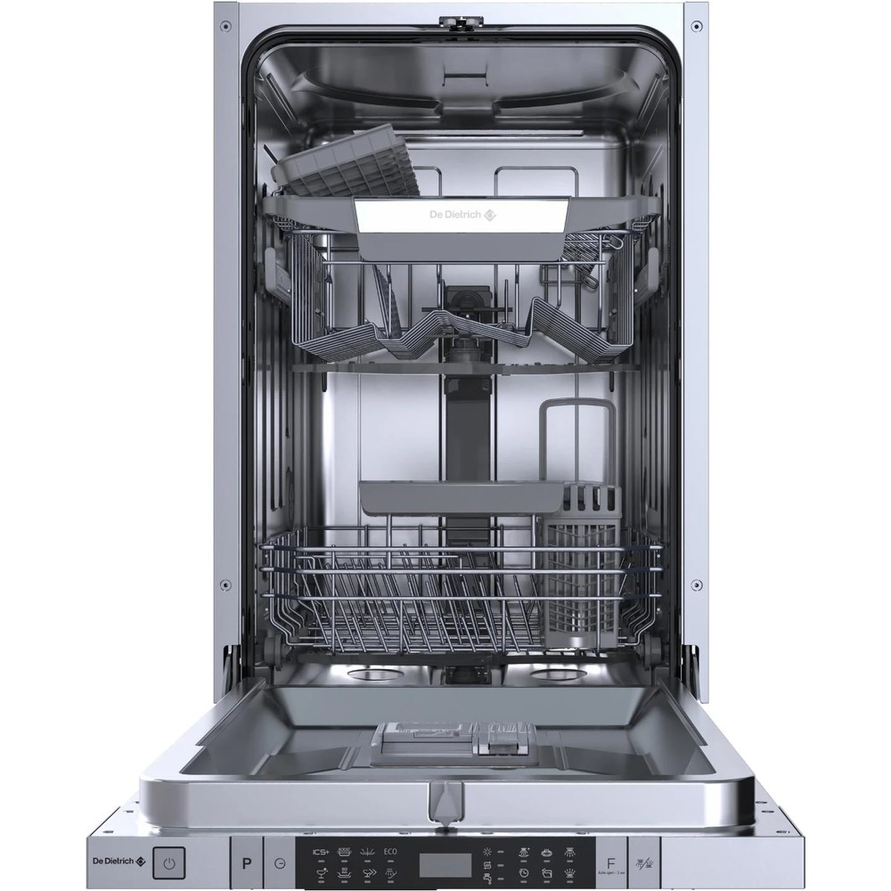 Вбудована посудомийна машина De Dietrich DV301044J шириною 45 см з функцією AutoDoor, завдяки якій дверцята посудомийної машини автоматично відчиняються після закінчення роботи. Панель управління розташована на краю дверцят, поза зоною видимості.