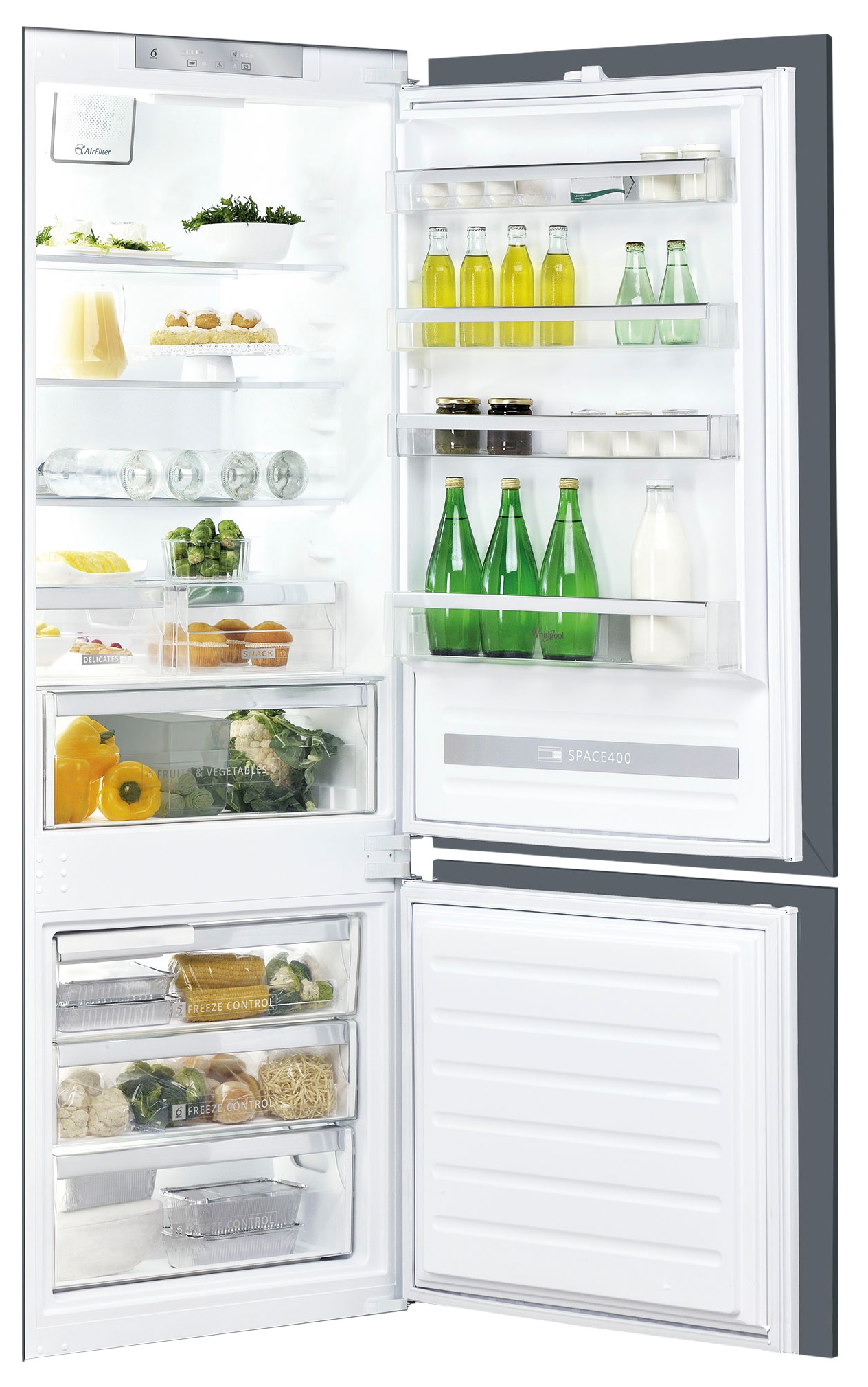 Вбудований холодильник Whirlpool SP40 801 EU з нижньою морозильною камерою пропонує максимум простору для зручного зберігання продуктів. Загальний обсяг — 400 літрів, триста з яких припадає на холодильну камеру. Для ефективного охолодження в ній встановлений вентилятор з антибактеріальним фільтром, який рівномірно розподіляє температуру і вологість по всьому відсіку. Завдяки функціональному наповненню холодильної камери, ви легко оптимізуєте простір для зручного зберігання продуктів. Крім високої полиці в дверцятах холодильника, є спеціальна підставка для безпечного зберігання пляшок в горизонтальному положенні.