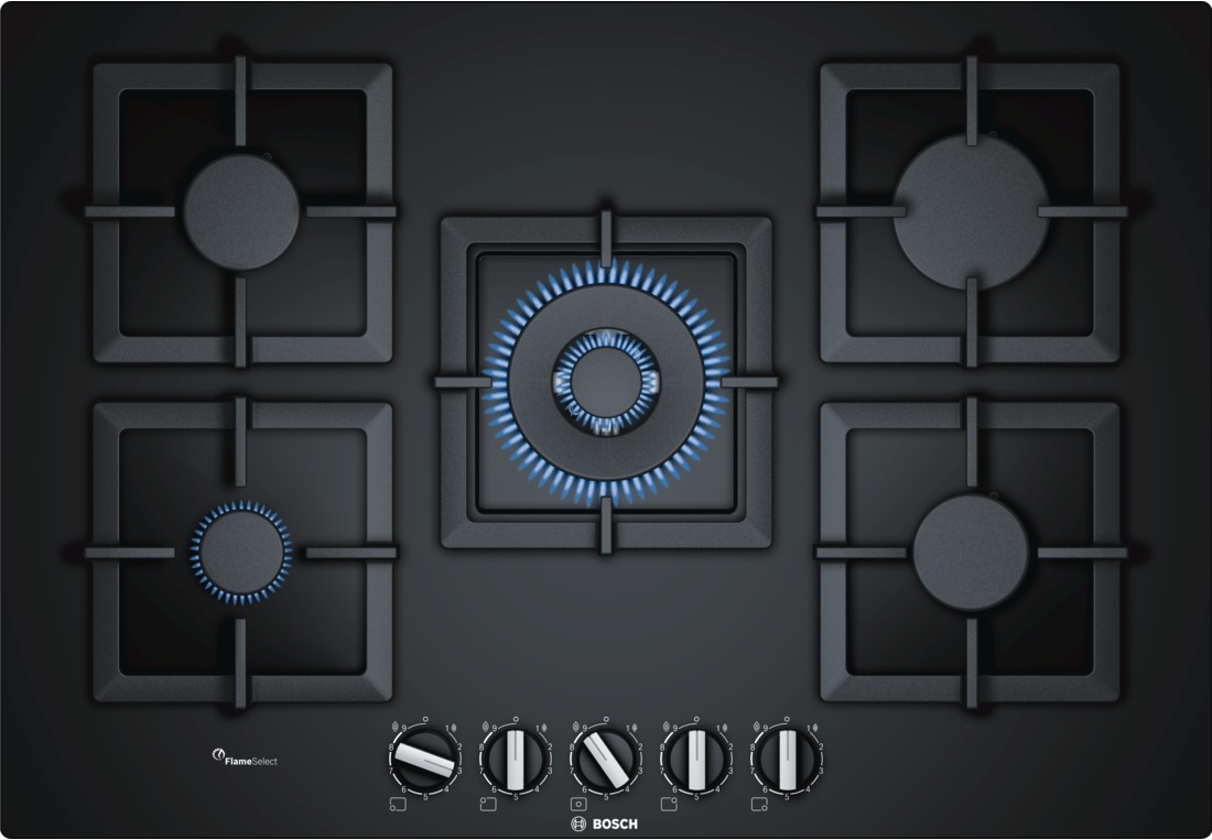 Serie | 6 Газова варильна панель Bosch PPQ7A6B20 шириною 75 см із загартованого скла з технологією FlameSelect: ідеальні кулінарні результати завдяки дев'яти точним ступеням потужності полум'я.