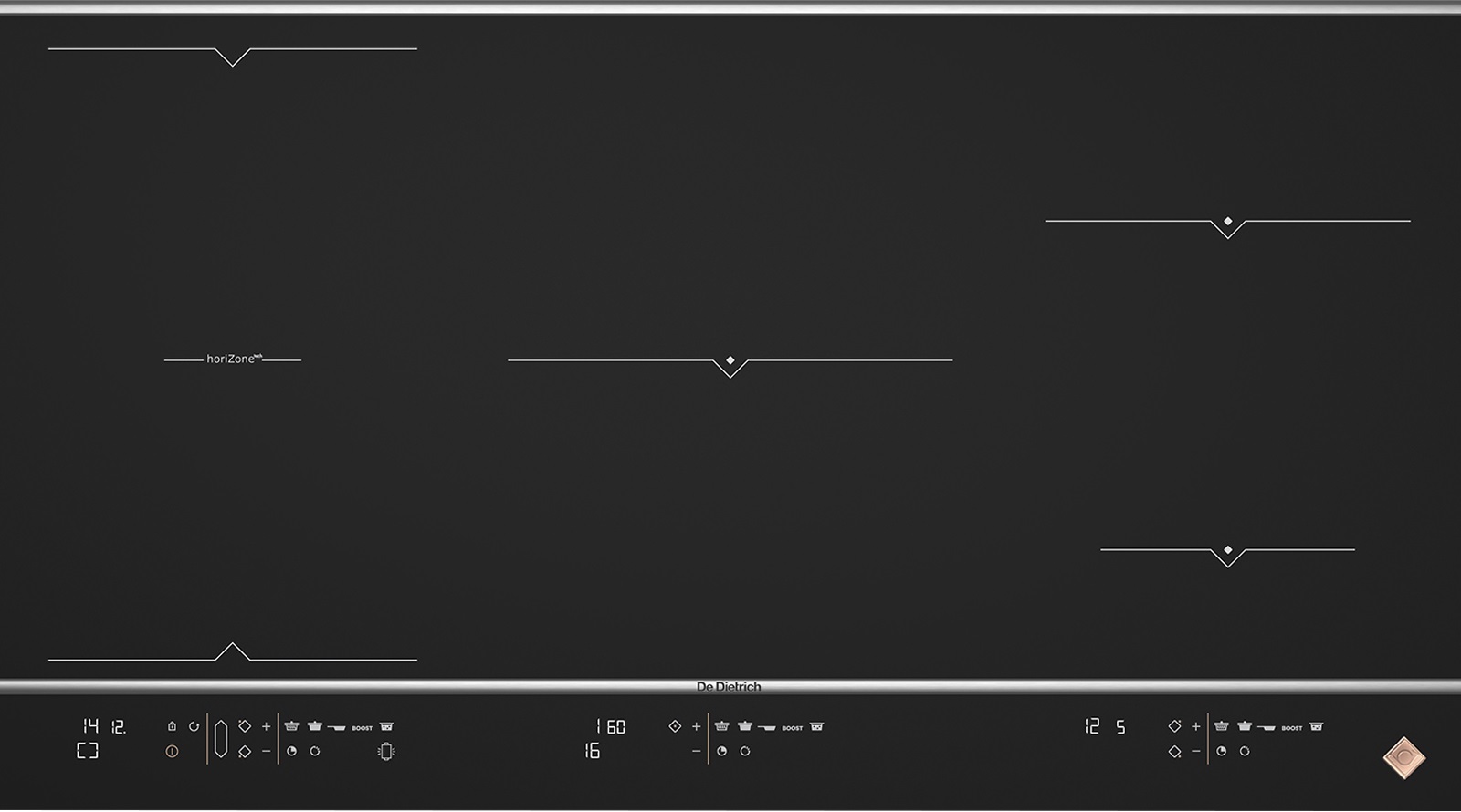 Варильна поверхня De Dietrich DPI7966XS з колекції Platinum шириною 90 см з п'ятьма незалежними індукційними конфорками, дві з яких можуть об'єднуватися в вільну зону horiZone. Виконана зі склокераміки чорного кольору. Має 20 рівнів потужності і 10 функцій безпеки. За допомогою цієї варильної поверхні horiZone Play Ви розкриєте свої кулінарні таланти. П'ять незалежних зон приготування, одна вільна зона і зона 28 см забезпечують користувачеві максимальну гнучкість в приготуванні їжі і досягають рівня потужності 5000 Вт.