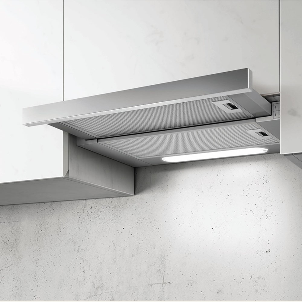 Стильна телескопічна витяжка Elica TT14 LUX GRIX/A/60 має високу продуктивність і може працювати в режимах відведення та рециркуляції повітря. Залежно від ступеня випарів доступни три швидкості швидкості всмоктування, вибір яких здійснюється за допомогою прихованої кнопкової панелі управління. Завдяки пристрою телескопічного корпусу приладу витяжка є досить компактною і легко впишеться практично в будь-який інтер'єр, так як не приваблює на себе зайвої уваги. Також розширена зона всмоктування дозволяє ефективніше вловлювати випаровування при готуванні, а світлодіодне освітлення забезпечує додатковий комфорт за робочою зоною.
