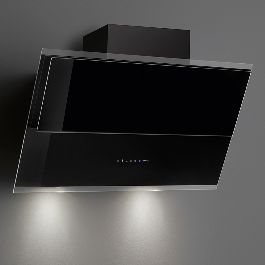 Витяжка Falmec VERSO NRS 85 Black (CVXN85.E1P2#ZZZN490F) — модель з фронтальною поверхнею з чорного скла, на якій знаходяться сенсорні елементи управління. Активні функції підсвічуються.