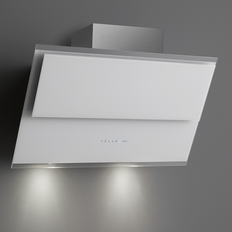 Витяжка Falmec VERSO NRS 85 White (CVXN85.E1P2#ZZZF490F) — модель з фронтальною поверхнею з білого скла, на якій знаходяться сенсорні елементи управління. Активні функції підсвічуються.