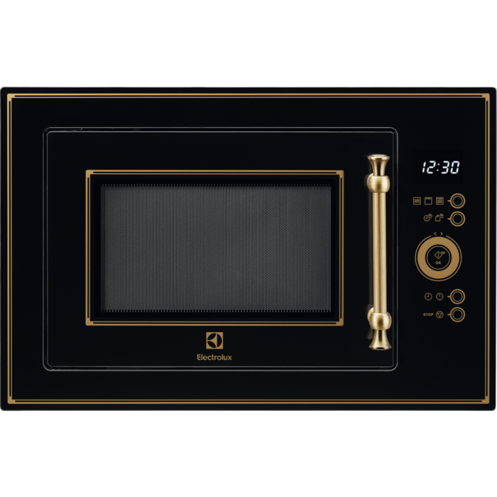 Нова вбудована мікрохвильова піч з грилем Electrolux EMT25203OK з колекції Electrolux Rococo виконана в чорному кольорі з латунною фурнітурою. Елегантний дизайн даної серії кухонних приладів створює затишну домашню атмосферу на кухні і залишає теплі спогади про час, проведений за сімейним столом. Вбудована мікрохвильова піч не займає місце на робочій поверхні та більш проста у догляді. Широкий функціонал даної моделі дозволяє не тільки розігрівати, але й готувати повноцінні страви, використовуючи режими з грилем і мікрохвилями.