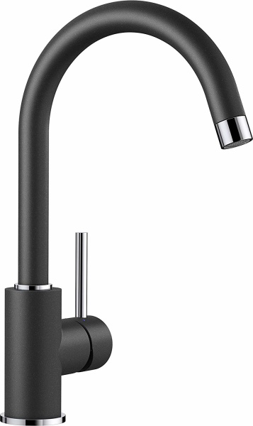 Одноважільний кухонний змішувач Blanco MIDA (519415) антрацит з високим виливом. Стильний дизайн приладу чудово впишеться в інтер'єр сучасної кухні, а вигнутий вилив гармонійно поєднується з мийкою круглої форми. Керамічний дисковий картридж Blanco забезпечує довговічну роботу змішувача і плавне регулювання води. Спеціальний фільтр механічних забруднень також покликаний забезпечити стабільну роботу приладу, захищаючи змішувач від засмічення і пошкоджень (малий тиск води, протікання). Особливістю даної моделі є зручна форма і високий поворотний вилив, за допомогою якого можна легко наповнити вазу або просто посуд з високими бортами.