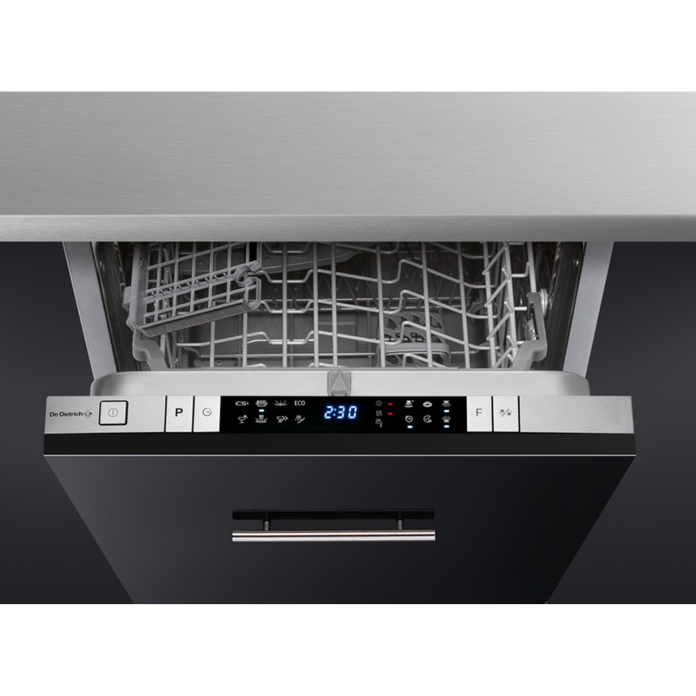 Встраиваемая посудомоечная машина De Dietrich DV01044J шириной 45 см. Панель управления расположена на краю дверцы, вне зоны видимости.