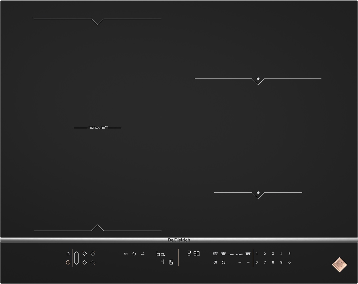 Индукционная варочная панель De Dietrich DPI7684X шириной 65 см из коллекции Platinum выполнена в чёрном цвете и оснащена четырьмя конфорками. Новая цифровая панель управления индукционной варочной поверхности Horizone имеет дисплей оптимальной четкости, который позволяет настраивать с максимальной точностью необходимую мощность от 1 до 20, а также предоставляет доступ ко всем запрограммированным функциям.