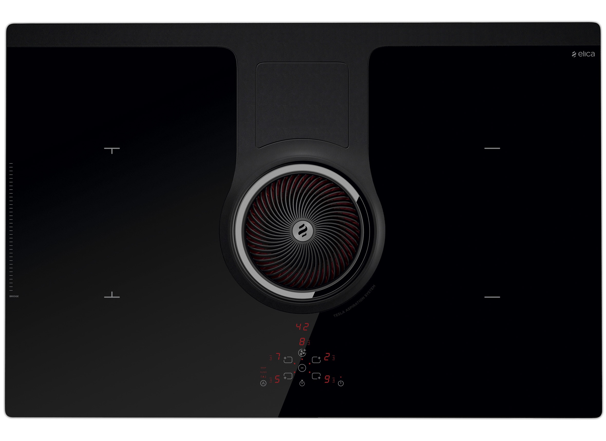 Первая индукционная варочная поверхность с функциями вытяжки от Elica. Эта система очищения воздуха с мотором, расположенным в центре, обладает высоким уровнем производительности, низким уровнем шума и энергопотребления.