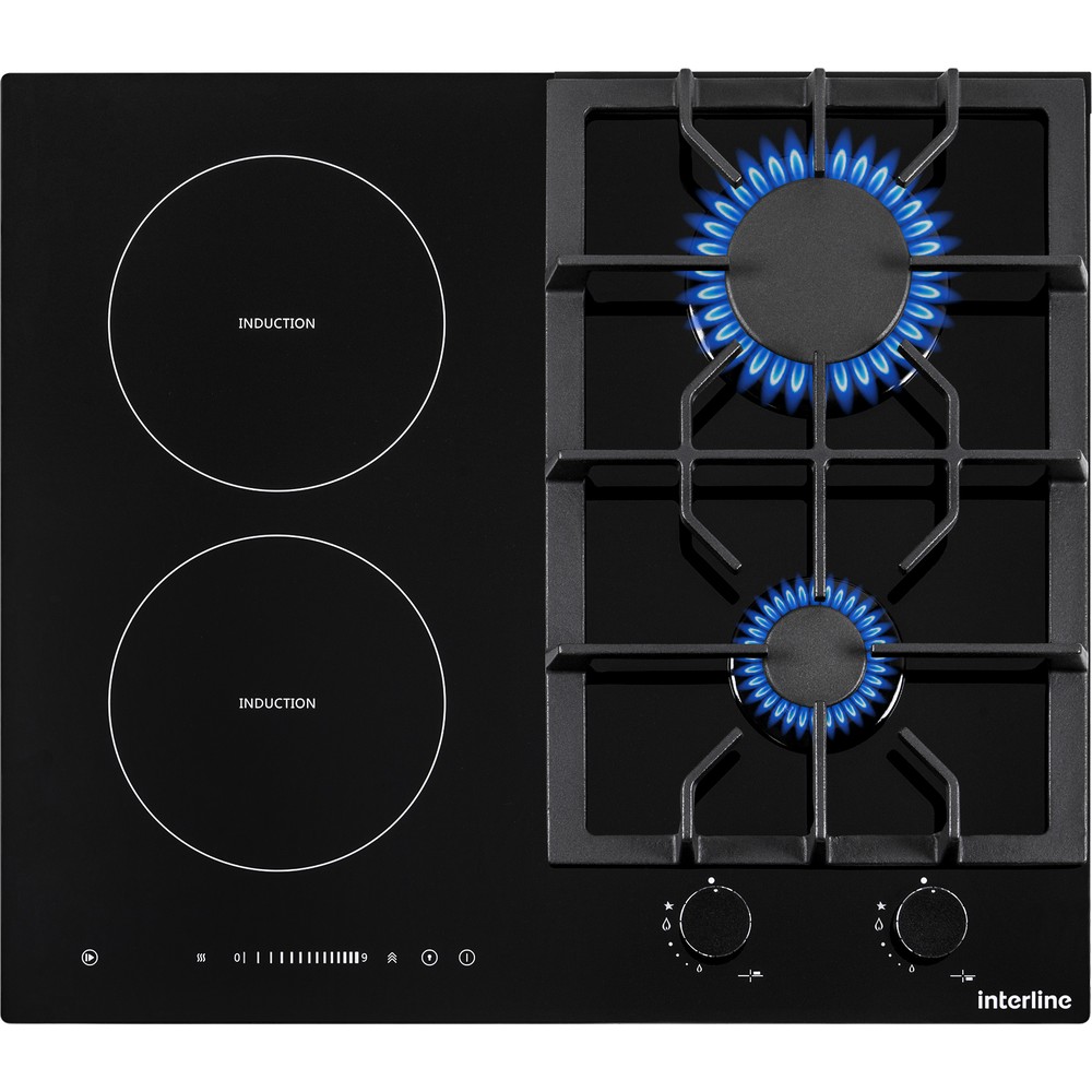 Комбинированная варочная поверхность Interline HCV 560 KGF BA оснащена двумя газовыми горелками и двумя электрическими, что значительно расширяет ее возможности во время готовки еды. Две индукционные конфорки имеют девять уровней мощности и режим повышенной производительности – Бустер. Также предусмотрена блокировка панели управления – Защита от детей.