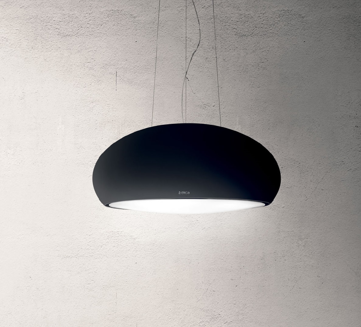 Дизайн. Уникальный вид вытяжки делает модель не просто вспомогательным кухонным оборудованием, но и полноценной частью интерьера. Корпус выполнен в матовом чёрном цвете, крепится к потолку на тонкие металлические тросы, создавая эффект двойного назначения: вытяжки и люстры.