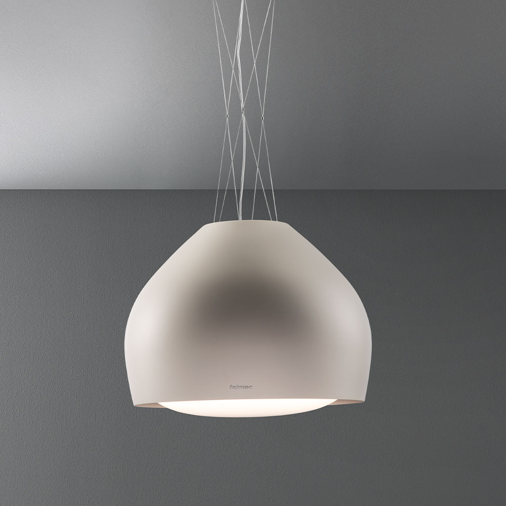 Вытяжка Falmec SOPHIE 54 BIANCO isola (CSWN54.E0P7#ZZZB461F) представлена в белом цвете. Модель выполнена в форме подвесной лампы. В плоскости периметрального всасывания располагается выпуклая панель из закаленного стекла.