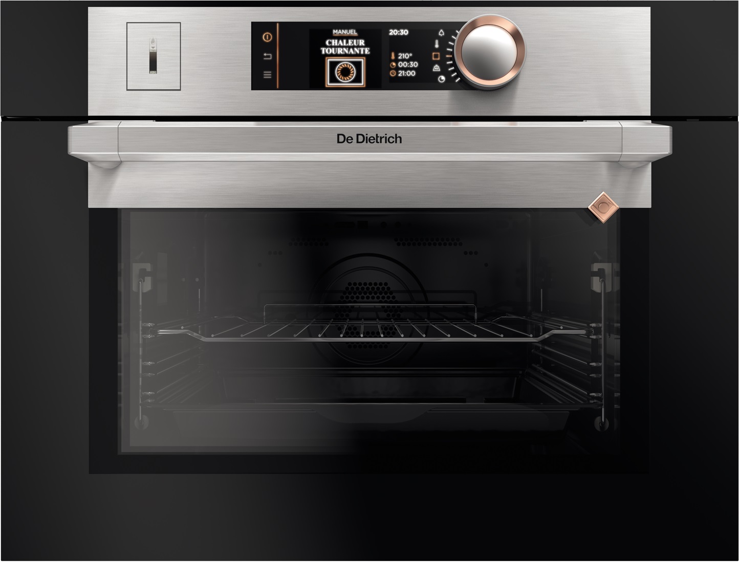 Этот компактный духовой шкаф DKR7580X с пиролизом «3 в 1» является настоящей жемчужиной коллекции Platinum и сокровищницей инновационных функций бренда De Dietrich. Вы можете выбрать между системой Multifunction Plus и «Приготовление на пару». Предусмотрена пиролитическая очистка «Пиро-турбо» с двумя циклами. Благодаря четырёхслойному остеклению дверца не нагревается во время работы. Стенки камеры объёмом 40 литров покрыты эмалью. Противни можно размещать на трёх уровнях. Есть режим «Сушка».
