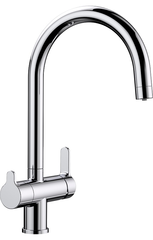 Blanco TRIMA (520840) хром — современный кухонный смеситель с функцией подключения фильтра. Особенностью данной модели является возможность подвода дополнительного шланга с питьевой фильтрованной водой. Для регулирования подачи фильтрованной и нефильтрованной воды служат два отдельных рычага. Подача воды осуществляется с помощью одного совмещенного излива с разделённым рассекателем, что экономит место за мойкой и является современным решением подачи питьевой воды.