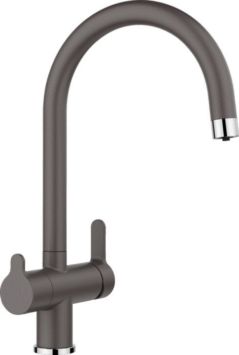 Blanco TRIMA (526221) темная скала — современный кухонный смеситель с функцией подключения фильтра. Особенностью данной модели является возможность подвода дополнительного шланга с питьевой фильтрованной водой. Для регулирования подачи фильтрованной и нефильтрованной воды служат два отдельных рычага. Подача воды осуществляется с помощью одного совмещенного излива с разделённым рассекателем, что экономит место за мойкой и является современным решением подачи питьевой воды.