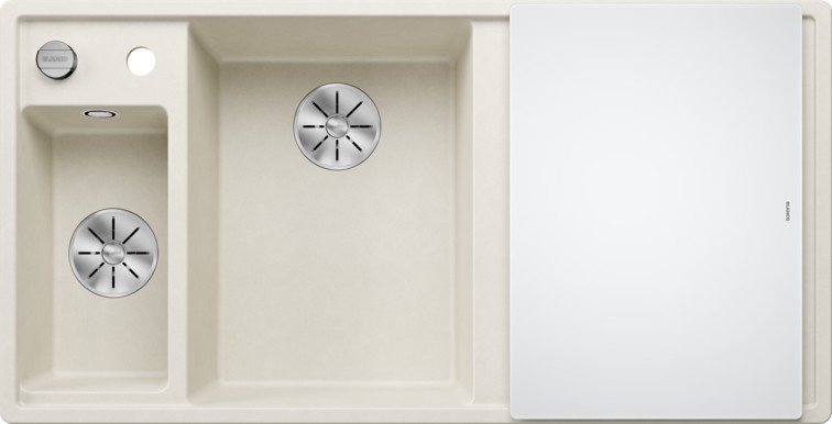 Blanco AXIA III 6S (527043) — мойка с удобным расположением основной чаши по центру для плавного течения рабочего процесса. Мойка оптимально сочетается с аксессуарами, как разделочная доска или колландер, который можно установить рядом с чашей. Скользящая стеклянная разделочная доска позволяют сбрасывать нарезанные продукты непосредственно в посуду. Мойка производится с двумя корзинчатыми вентилями InFino® 3 ½", которые выгодно дополняют современным и эргономичным дизайном конструкции.