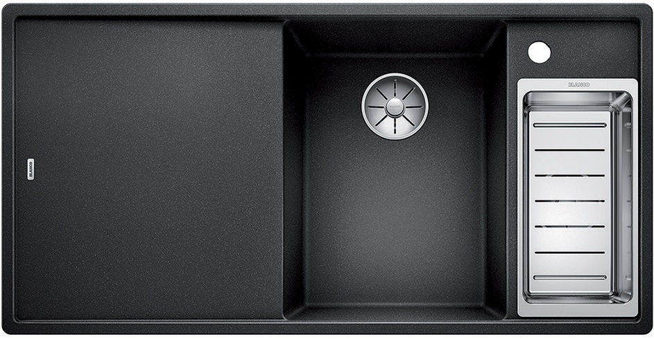 Blanco AXIA III 6S (523462) — мийка зі зручним розташуванням основної чаші по центру для плавної течії робочого процесу. Мийка оптимально поєднується із аксесуарами, такими як обробна дошка або колландер, який можна встановити поруч з чашею. Обробна дошка виконується з ковзаючою поверхнею для зручного скидання нарізаних продуктів в посуд, що знаходиться в чаші. Мийка виробляється з двома корзинчатими вентилями InFino® 3 ½", які вигідно доповнюють сучасним і ергономічним дизайном конструкції.