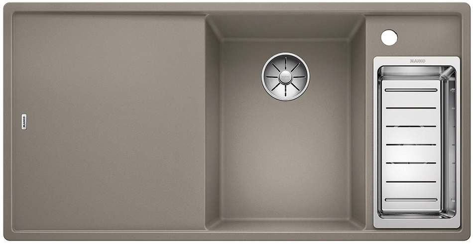 Blanco AXIA III 6S (523469) — мийка зі зручним розташуванням основної чаші по центру для плавної течії робочого процесу. Мийка оптимально поєднується із аксесуарами, такими як обробна дошка або колландер, який можна встановити поруч з чашею. Обробна дошка виконується з ковзаючою поверхнею для зручного скидання нарізаних продуктів в посуд, що знаходиться в чаші. Мийка виробляється з двома корзинчатими вентилями InFino® 3 ½", які вигідно доповнюють сучасним і ергономічним дизайном конструкції.