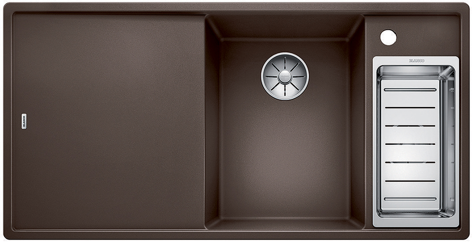 Blanco AXIA III 6S (523471) — мийка зі зручним розташуванням основної чаші по центру для плавної течії робочого процесу. Мийка оптимально поєднується із аксесуарами, такими як обробна дошка або колландер, який можна встановити поруч з чашею. Обробна дошка виконується з ковзаючою поверхнею для зручного скидання нарізаних продуктів в посуд, що знаходиться в чаші. Мийка виробляється з двома корзинчатими вентилями InFino® 3 ½", які вигідно доповнюють сучасним і ергономічним дизайном конструкції.