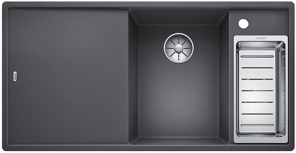 Blanco AXIA III 6S (523473) — мийка зі зручним розташуванням основної чаші по центру для плавної течії робочого процесу. Мийка оптимально поєднується із аксесуарами, такими як обробна дошка або колландер, який можна встановити поруч з чашею. Обробна дошка виконується з ковзаючою поверхнею для зручного скидання нарізаних продуктів в посуд, що знаходиться в чаші. Мийка виробляється з двома корзинчатими вентилями InFino® 3 ½", які вигідно доповнюють сучасним і ергономічним дизайном конструкції.