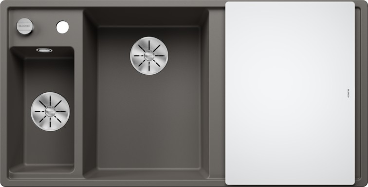 Blanco AXIA III 6S (527226) — мийка зі зручним розташуванням основної чаші по центру для плавної течії робочого процесу. Мийка оптимально поєднується із аксесуарами, такими як обробна дошка або колландер, який можна встановити поруч з чашею. Ковзна скляна обробна дошка дозволяє скидати нарізані продукти безпосередньо в посуд. Мийка виробляється з двома корзинчатими вентилями InFino® 3 ½", які вигідно доповнюють сучасним і ергономічним дизайном конструкції.