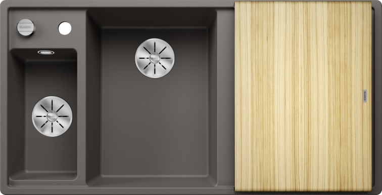 Blanco AXIA III 6S (527227) — мийка зі зручним розташуванням основної чаші по центру для плавної течії робочого процесу. Мийка оптимально поєднується із аксесуарами, такими як обробна дошка або колландер, який можна встановити поруч з чашею. Ковзаючий вздовж поверхні обробний столик дозволяє скидати нарізані продукти безпосередньо в посуд. Мийка виробляється з двома корзинчатими вентилями InFino® 3 ½", які вигідно доповнюють сучасним і ергономічним дизайном конструкції.