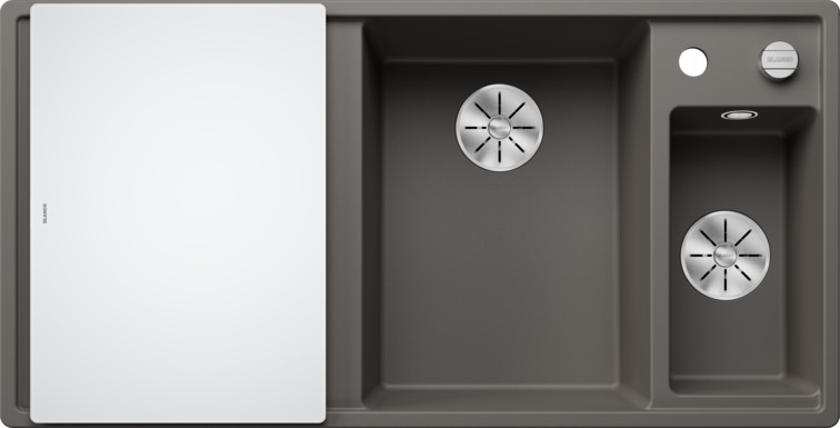 Blanco AXIA III 6S (527228) — мийка зі зручним розташуванням основної чаші по центру для плавної течії робочого процесу. Мийка оптимально поєднується із аксесуарами, такими як обробна дошка або колландер, який можна встановити поруч з чашею. Ковзна скляна обробна дошка дозволяє скидати нарізані продукти безпосередньо в посуд. Мийка виробляється з двома корзинчатими вентилями InFino® 3 ½", які вигідно доповнюють сучасним і ергономічним дизайном конструкції.
