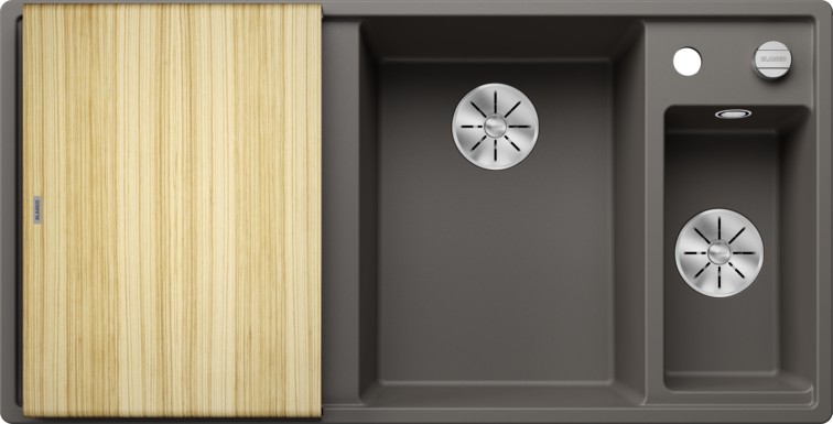 Blanco AXIA III 6S (527229) — мийка зі зручним розташуванням основної чаші по центру для плавної течії робочого процесу. Мийка оптимально поєднується із аксесуарами, такими як обробна дошка або колландер, який можна встановити поруч з чашею. Ковзаючий вздовж поверхні обробний столик дозволяє скидати нарізані продукти безпосередньо в посуд. Мийка виробляється з двома корзинчатими вентилями InFino® 3 ½", які вигідно доповнюють сучасним і ергономічним дизайном конструкції.