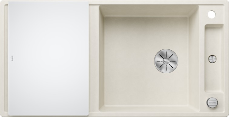 Blanco AXIA III XL 6S (527051) — мийка зі зручним розташуванням основної чаші по центру для плавної течії робочого процесу. Мийка оптимально поєднується із аксесуарами, такими як обробна дошка або колландер, який можна встановити поруч з чашею. Ковзна скляна обробна дошка дозволяє скидати нарізані продукти безпосередньо в посуд. Мийка виробляється з двома корзинчатими вентилями InFino® 3 ½", які вигідно доповнюють сучасним і ергономічним дизайном конструкції.